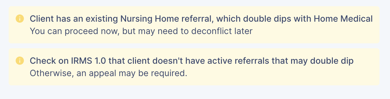 Yes! When you select the referral services to raise, BRIGHT will check in-system for referrals that double dip. If there are any, you will see an alert like the example below.