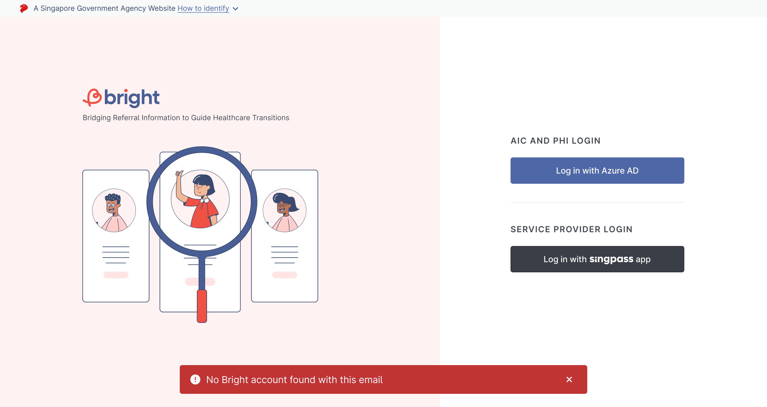 If you are seeing the error message "No Bright account found with this email", this means that your AzureAD login is successful, but there may be issues with your account on BRIGHT. Please approach your organisation's endorsing officer or BRIGHT admins to check on your account via their "Manage User" page under settings. They may search for your account using your email address or your name. You can search for your endorsing officers here!