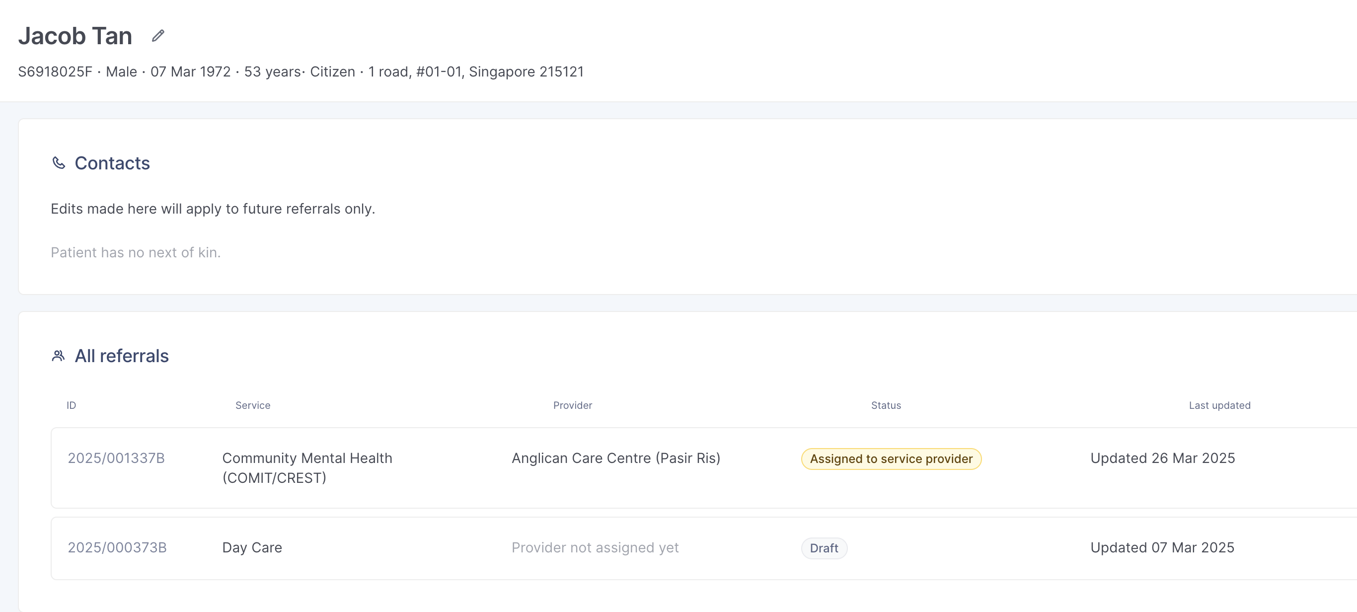 You may view all referrals currently tagged to a patient/client under their profile. Click on their name to access the profile page.