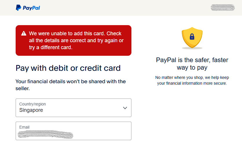 I am not able to pay using PayPal – the error message indicates that “unable to add this card”.