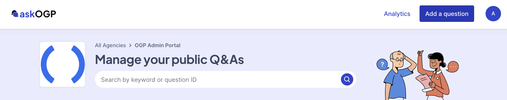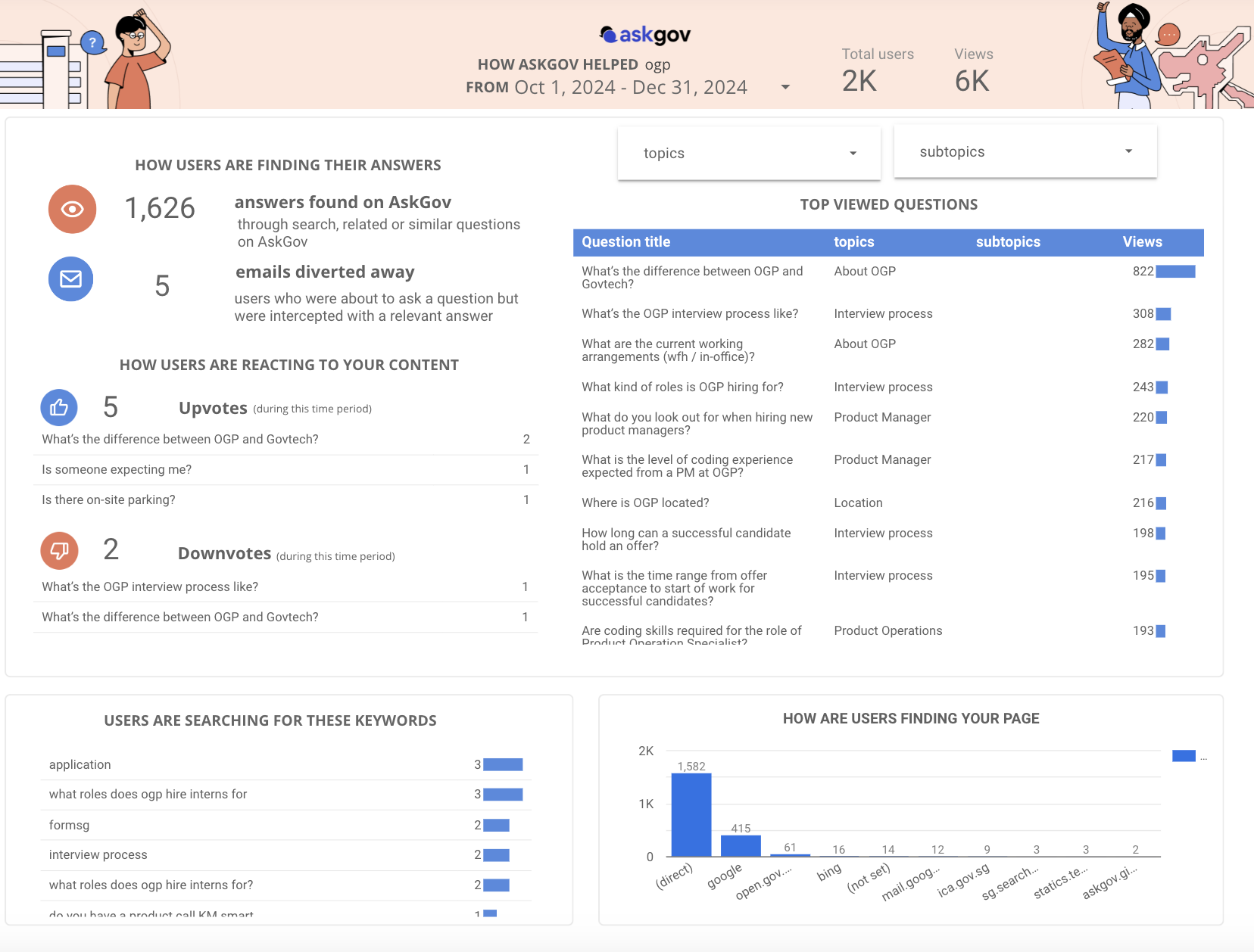 • Views: The total number of times pages were viewed on AskGov. A single user can generate multiple page views across different sections, such as the homepage, "Ask a Question" page, and FAQ page.