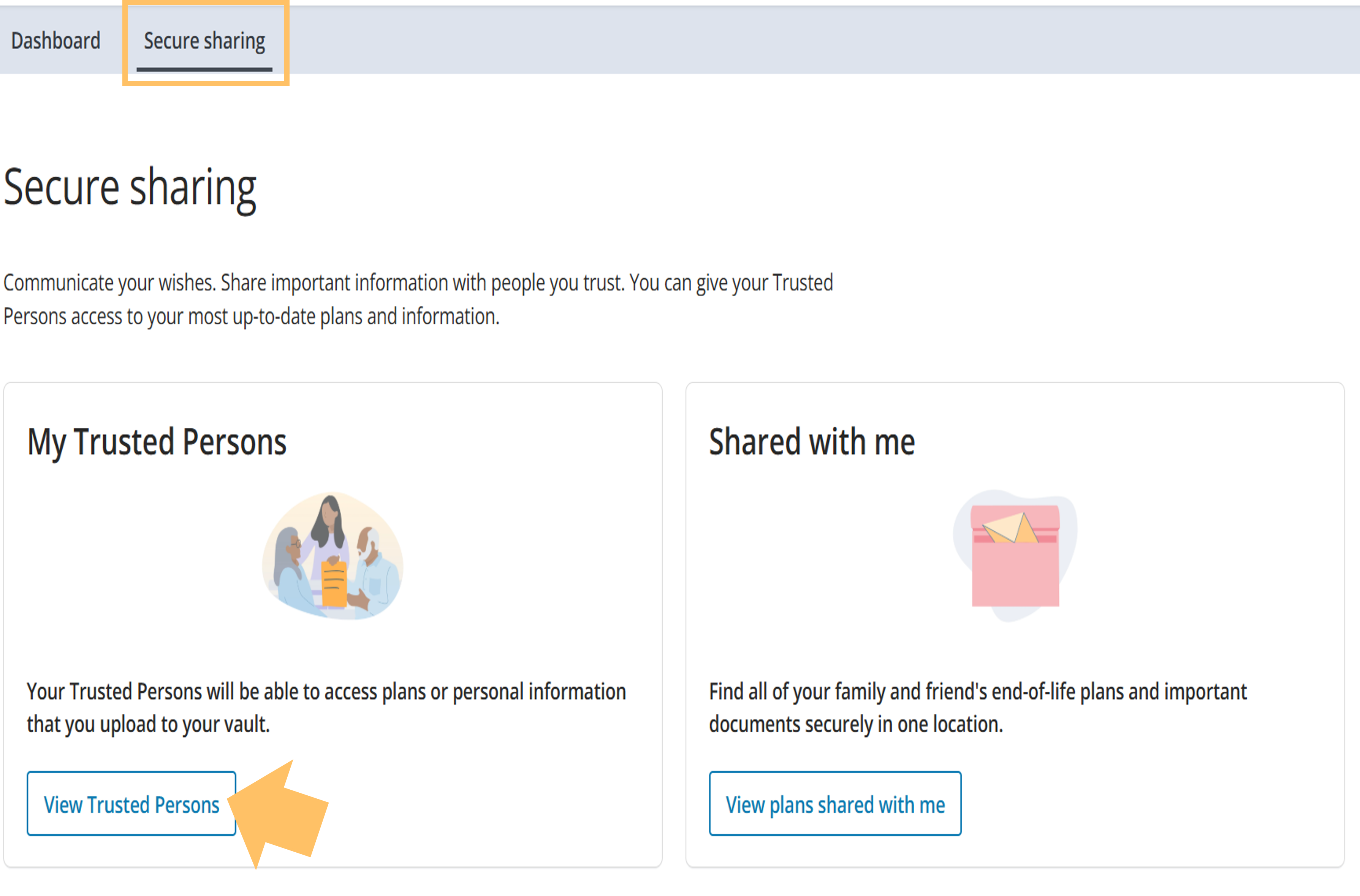 To add a Trusted Person, login via Singpass to My Legacy vault. Under “Secure Sharing”, click on “View Trusted Persons”.