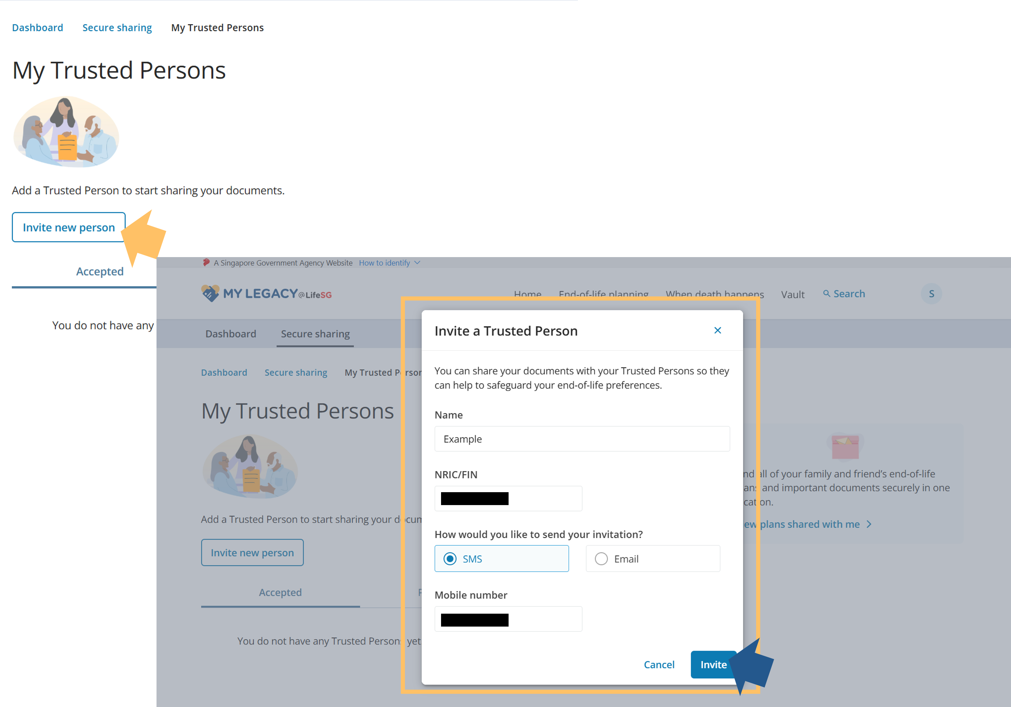 Then, click on “Invite new person” and key in the details as prompted before clicking on “Invite” to confirm the invitation. If your trusted person does not receive the notification via SMS / Email, please ask them to login directly to Vault to accept the invitation. Note that invites expire in 3 weeks and you only can add the same person up to 5 times before you are unable to add them anymore.