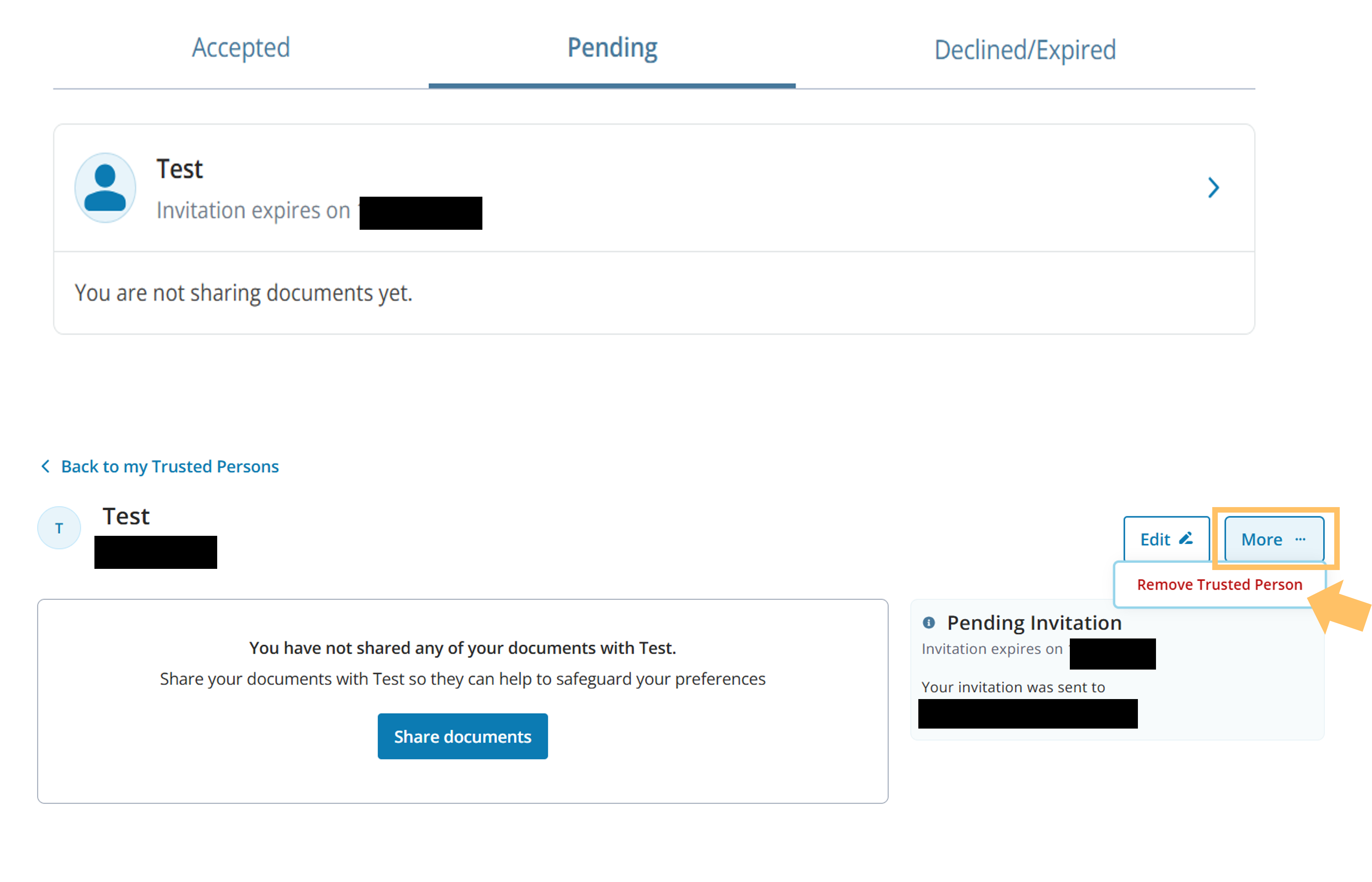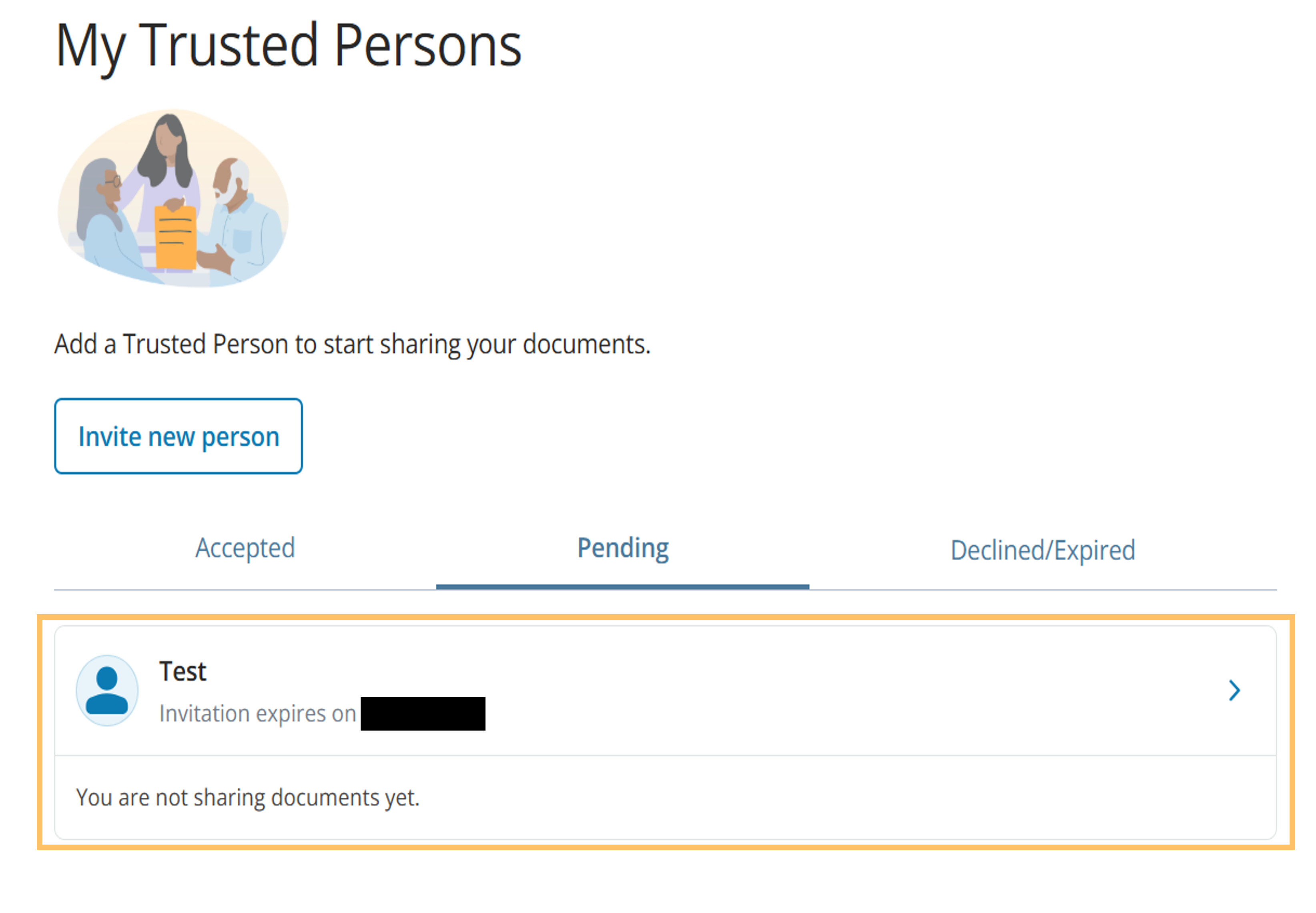 Once successful, you should see a pending invite which will shift into the “Accepted” tab, once your Trusted Person has accepted the invite.