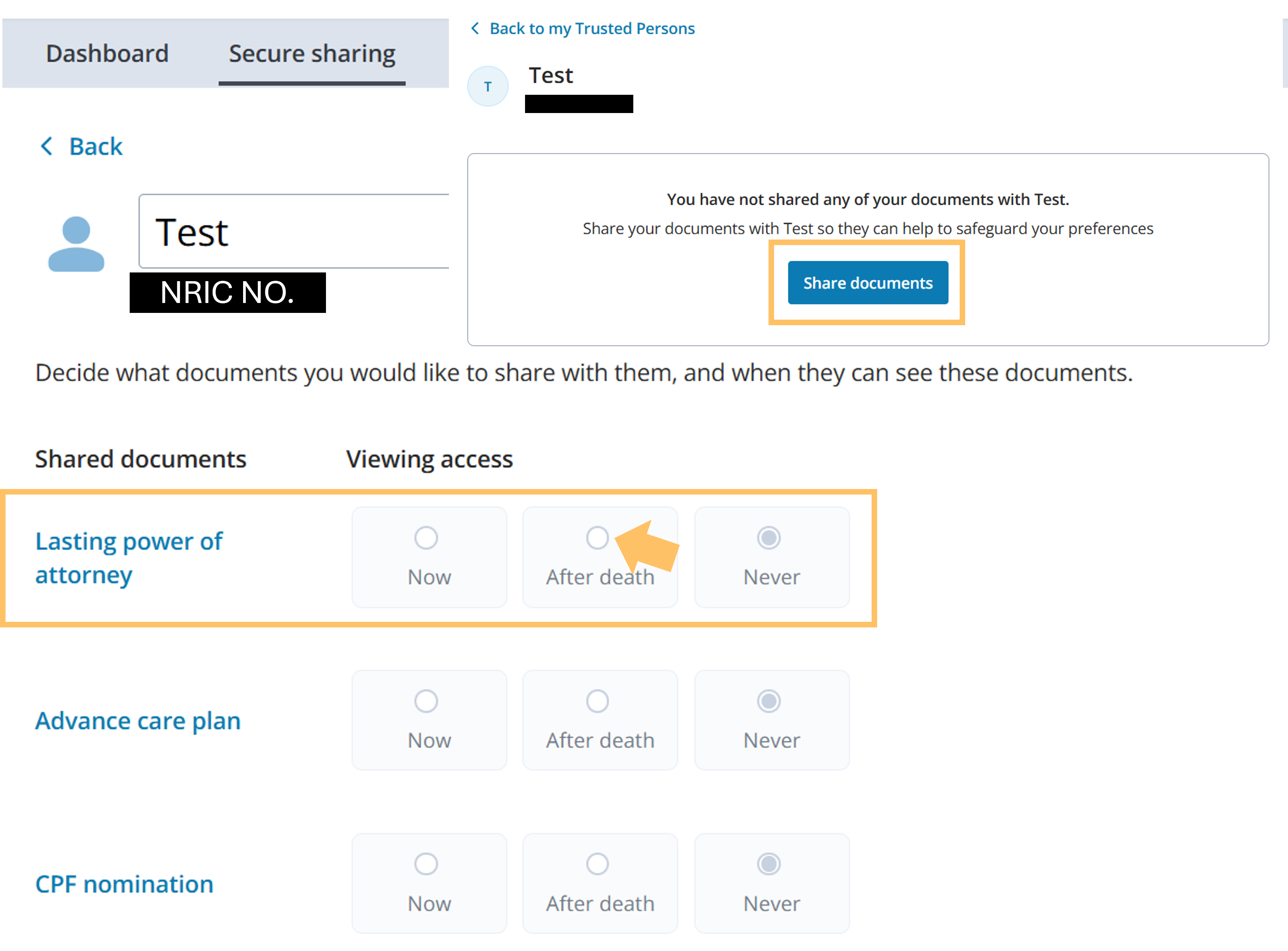 Once a Trusted Person has accepted the invite, click on the added Trusted Person, then click “Share Documents”. Under the Share Documents page, select between “Now, After Death or Never” to choose which access the Trusted Person has.