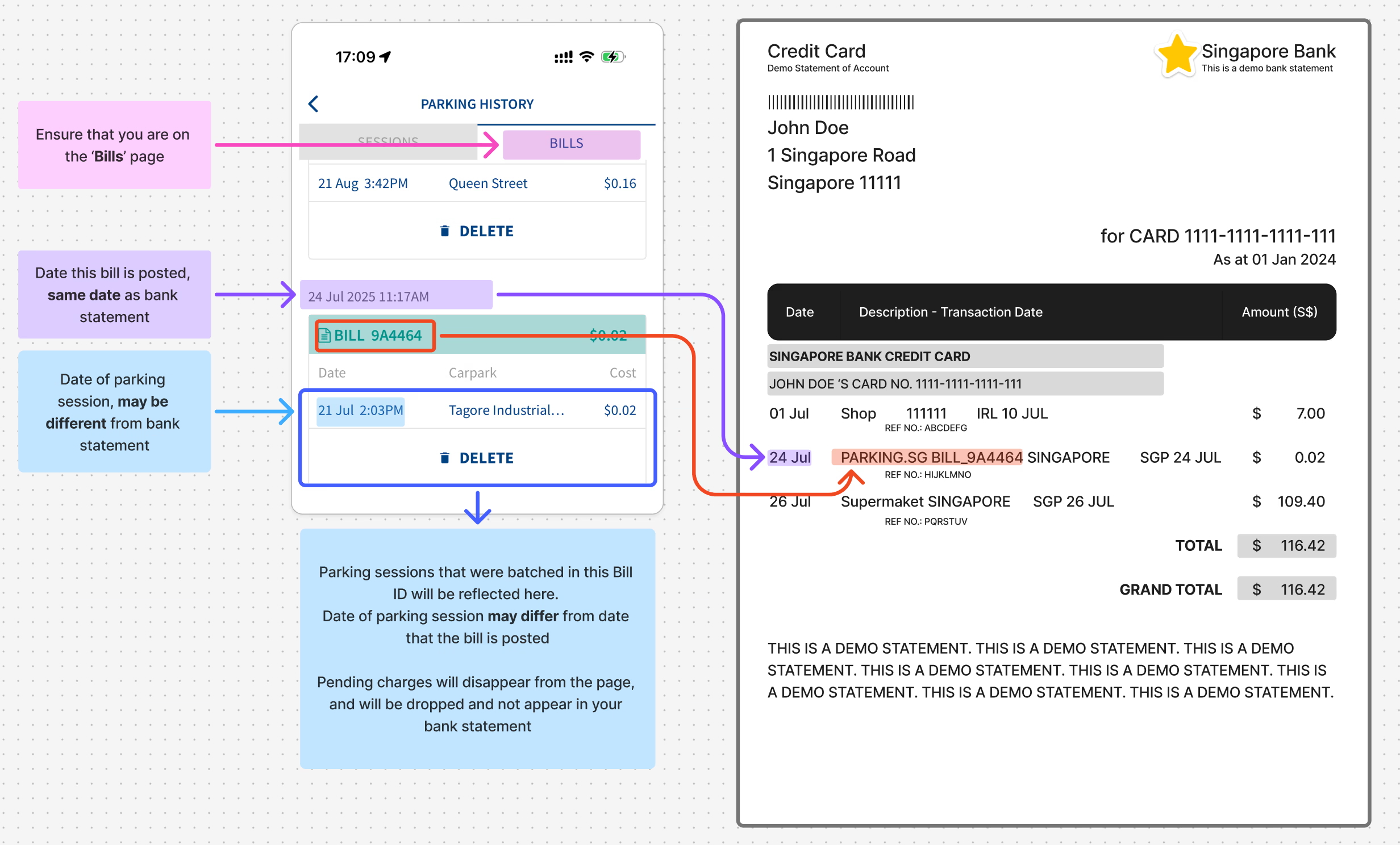 To verify your charges, you can match the Bill ID (PARKING.SG BILL_XXXXXXX) on your bank statement with the records in the app: