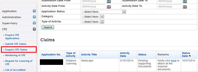 (i) Log in and click on “Enquire CPE Claims” to find the application.