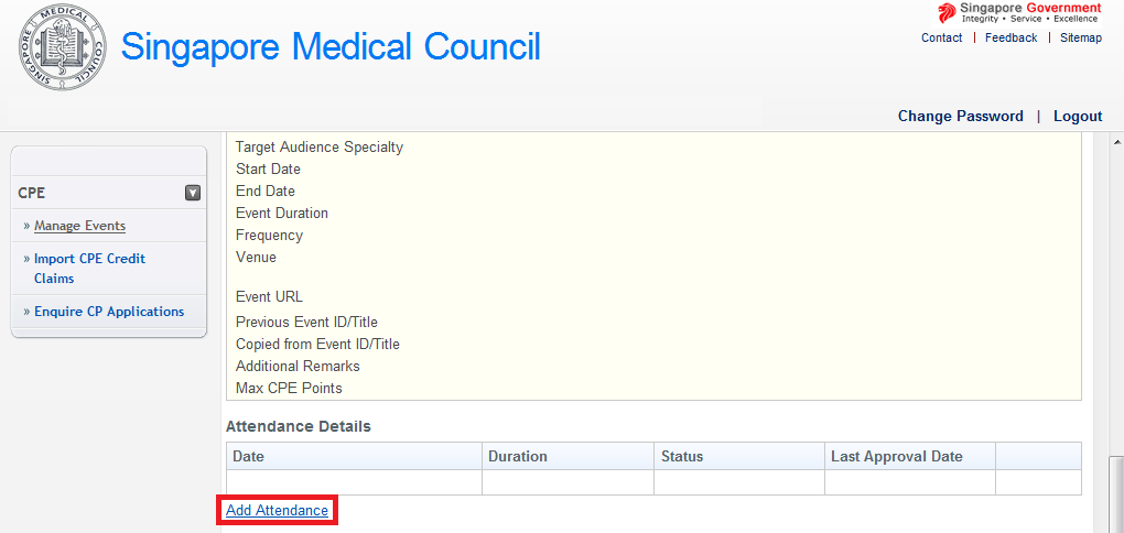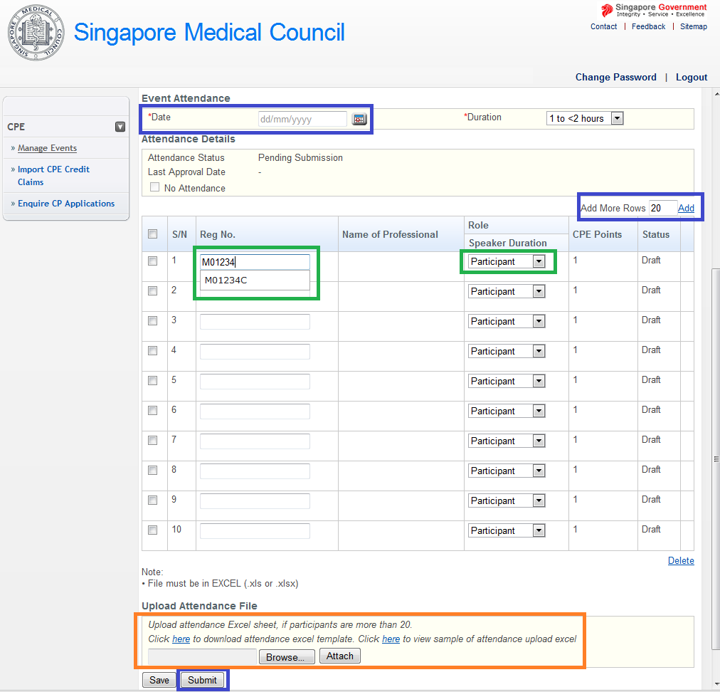 If you have a large number in attendance, e.g. 100 doctors, download the systems excel template and upload the attendance file.
