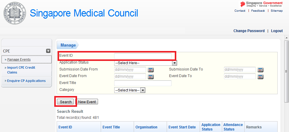 Your event application will appear under “Search Result”. Click on your event ID to access the application.