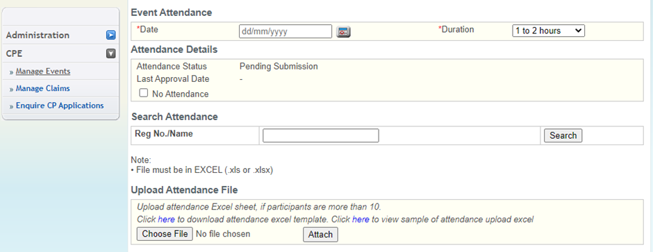 If you have a large number in attendance, e.g. 100 nurses, download the systems excel template and upload the attendance file.