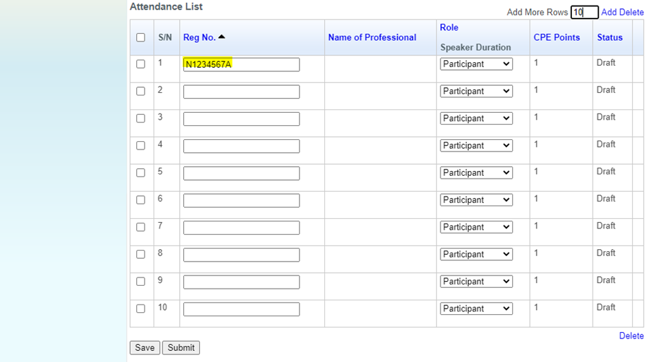 Click on “Add More Rows” and change the number according to the number of additional records. Proceed to include the additional names and click on “Submit” to complete the update.