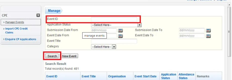 Your event application will appear under “Search Result”. Click on your event ID to access the application.