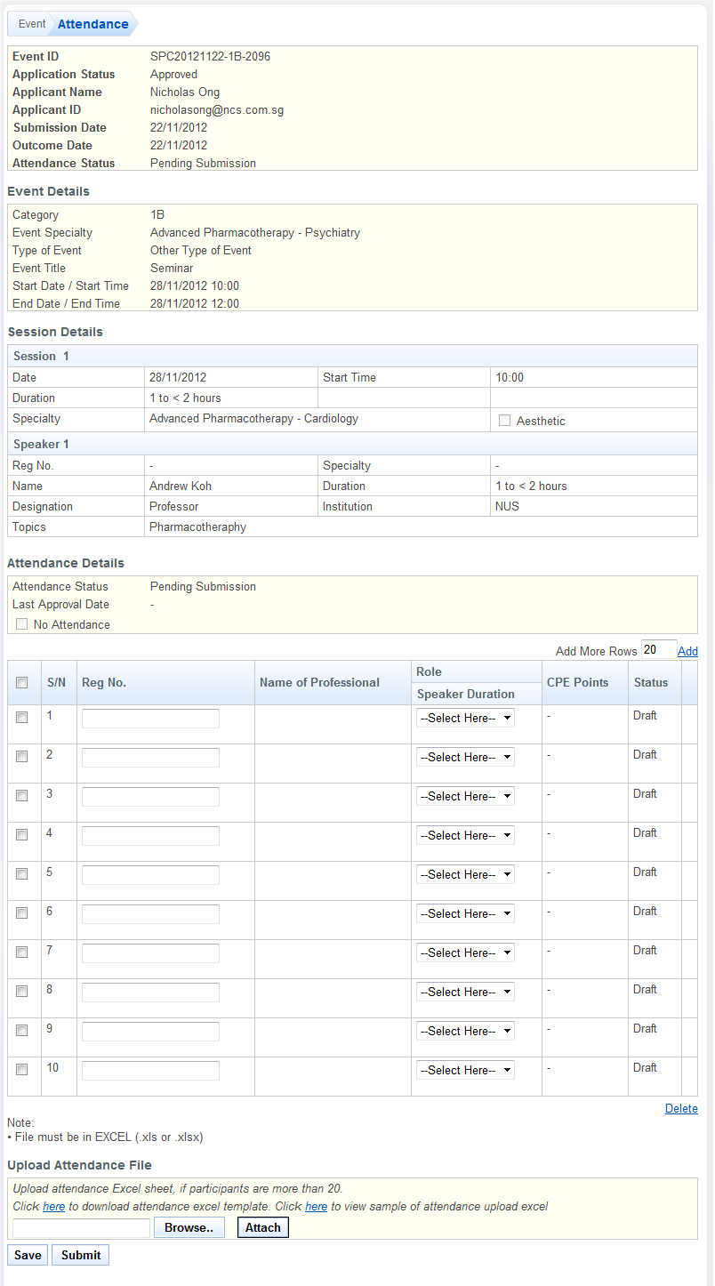Mass upload of attendance function is available to facilitate the uploading of attendance list. A certain format of attendance template must be used for successful uploading. To view the excel sheet template of attendance, click the [here] link, under “Upload Attendance File”.
